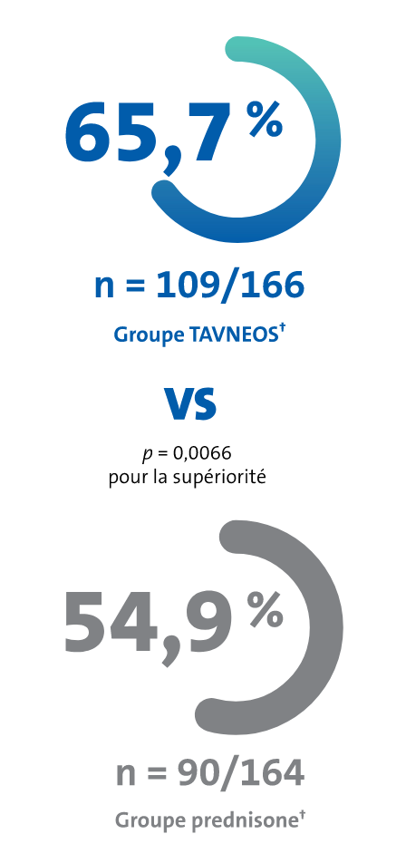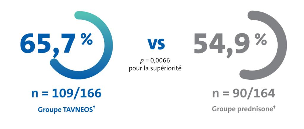 TAVNEOS n’a pas été inférieur à la prednisone quant à la proportion de sujets ayant obtenu une rémission de la maladie à la semaine 26 : 72,3 % vs 70,1 %, respectivement (paramètre d’évaluation principal; p < 0,0001 pour la non-infériorité)1*